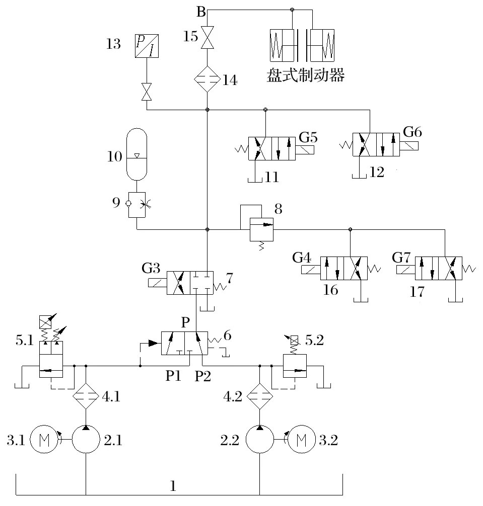 液壓站可以為盤式制動器提供不同油壓的壓力油,油壓的變化由電液比例溢流閥來調節。制動系統正常工作時,電動機 3.1 通電,電磁鐵 G3、G4、G5、G6、G7 得電,液壓泵 2.1 的壓力油經過過濾器4.1、液動換向閥 6、電磁換向閥 7、過濾器 14、球閥15 和出油口 B 進入盤式制動器。司機可以通過調節比例溢流閥 5.1 的比例電磁鐵,以控制電壓實現油壓的變化,從而達到調節制動力矩的目的。當控制電壓增加時,系統油壓升高,制動器開閘;當控制電壓減小時,制動系統油壓下降,制動器合閘;當控制電壓減小至零時,制動系統的油壓很低,降為殘壓,提升機處于完全制動狀態。