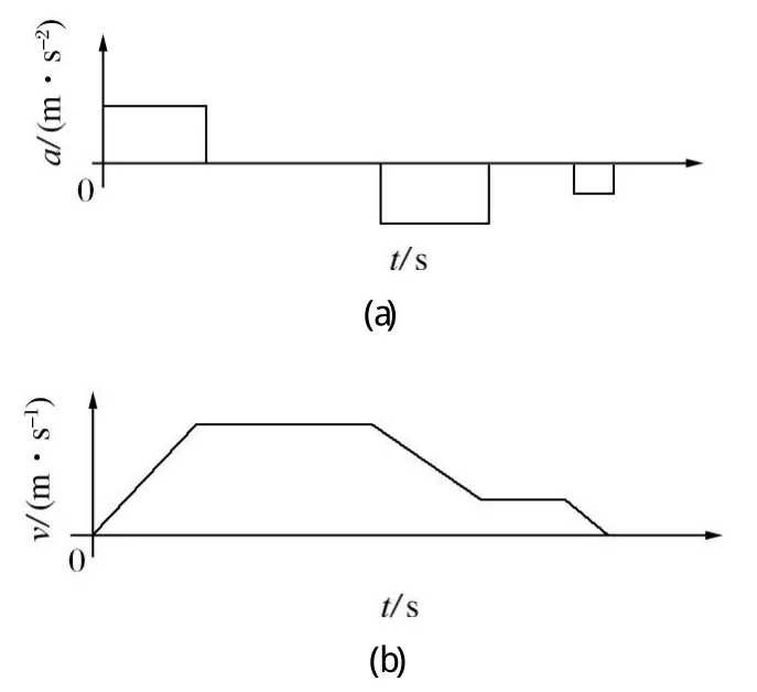 (4)重視提升系統(tǒng)沖擊限制,常用的有矩形加/減速度控制和梯形加/減速度控制,分別如圖1、2所示。采用梯形加/減速度控制曲線,并且加/減速度的變化率不宜大于 0.3 m/s3,以減少加/減速過程中提升鋼絲繩所受的動(dòng)張力及彈性振動(dòng)。新建礦井尤其是深井提升系統(tǒng)宜采用恒減速制動(dòng),可有效控制緊急制動(dòng)過程中提升鋼絲繩的動(dòng)張力,同時(shí)避免提升鋼絲繩打滑現(xiàn)象。
