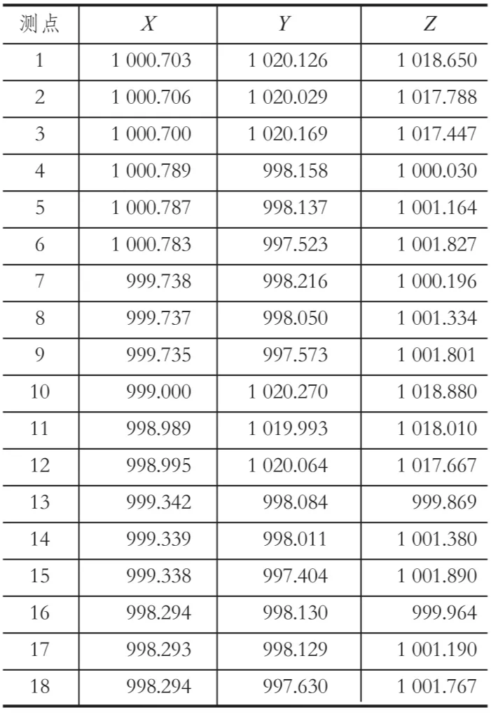 在機(jī)房內(nèi)選擇通視條件良好的位置架設(shè)全站儀,建立假定坐標(biāo)系,取測站坐標(biāo) O(1000,1000,1000),在每個(gè)天輪繩槽中間測定 1 組數(shù)據(jù) (每組 3 點(diǎn)),共測定 2 組;在卷筒擋繩板兩側(cè)內(nèi)壁各測定 1 組數(shù)據(jù) (每組 3 點(diǎn)),共 4 組。測量的數(shù)據(jù)如表 1 所列。表中,測點(diǎn) 1~ 3 為 1 號(hào)天輪實(shí)測坐標(biāo),4~ 9 為 1 號(hào)天輪對(duì)應(yīng)坐標(biāo),10~ 12 為 2 號(hào)天輪實(shí)測坐標(biāo),13~ 18 為 2 號(hào)天輪對(duì)應(yīng)坐標(biāo)。