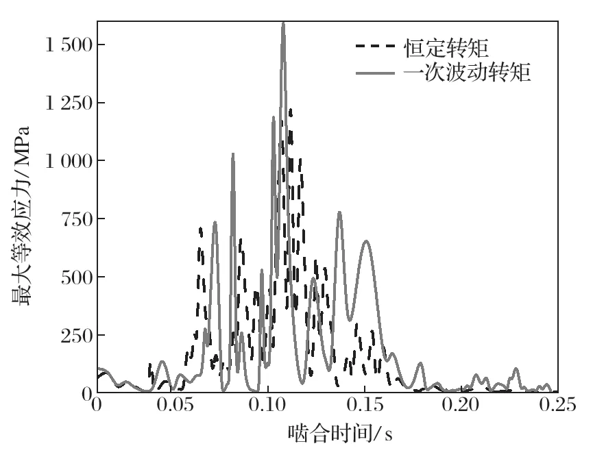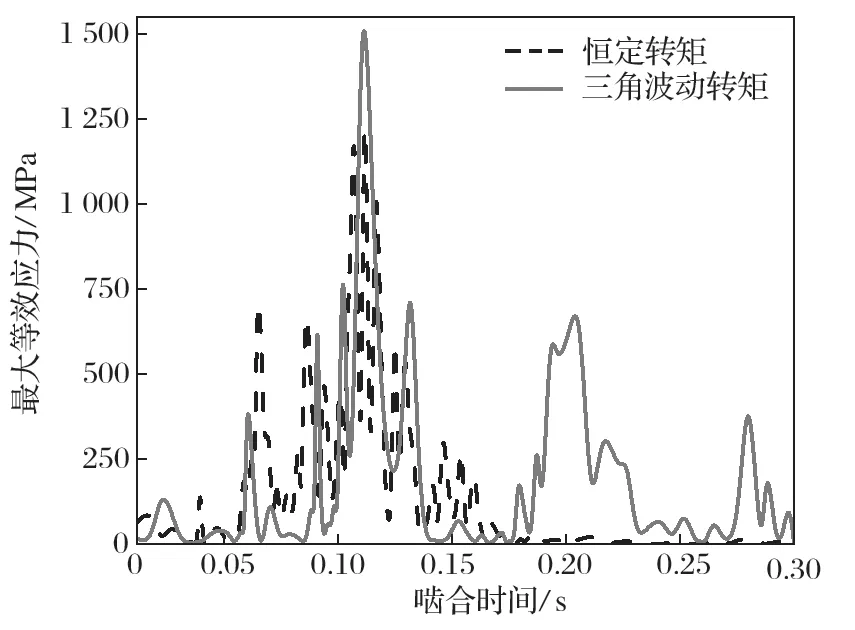 在有限元模型中,利用探針提取從動輪一個齒面與一個齒根面的zui大等效應力。觀察恒定轉矩的zui大等效應力變化,當齒輪嚙合時間到達0.11s 時,位于從動輪齒面與齒根面的zui大等效應力達到zui大,zui大等效應力處于齒根處;應力的變化趨勢整體呈現(xiàn)出金字塔形;隨著同步齒輪嚙合的進行,zui大等效應力的幅值逐步升高;達到zui高點之后,應力幅值又逐步降低,表明嚙合過程的結束。因為齒輪嚙合過程中是單齒對接觸與兩齒對接觸交替出現(xiàn)形式,所以會出現(xiàn)zui大等效應力的波動。當處于單齒對接觸時,應力波動大,同時應力值將達到zui大;在雙嚙合區(qū),其所受載荷與接觸壓力較平穩(wěn),受到?jīng)_擊較小,且應力波動較小。
