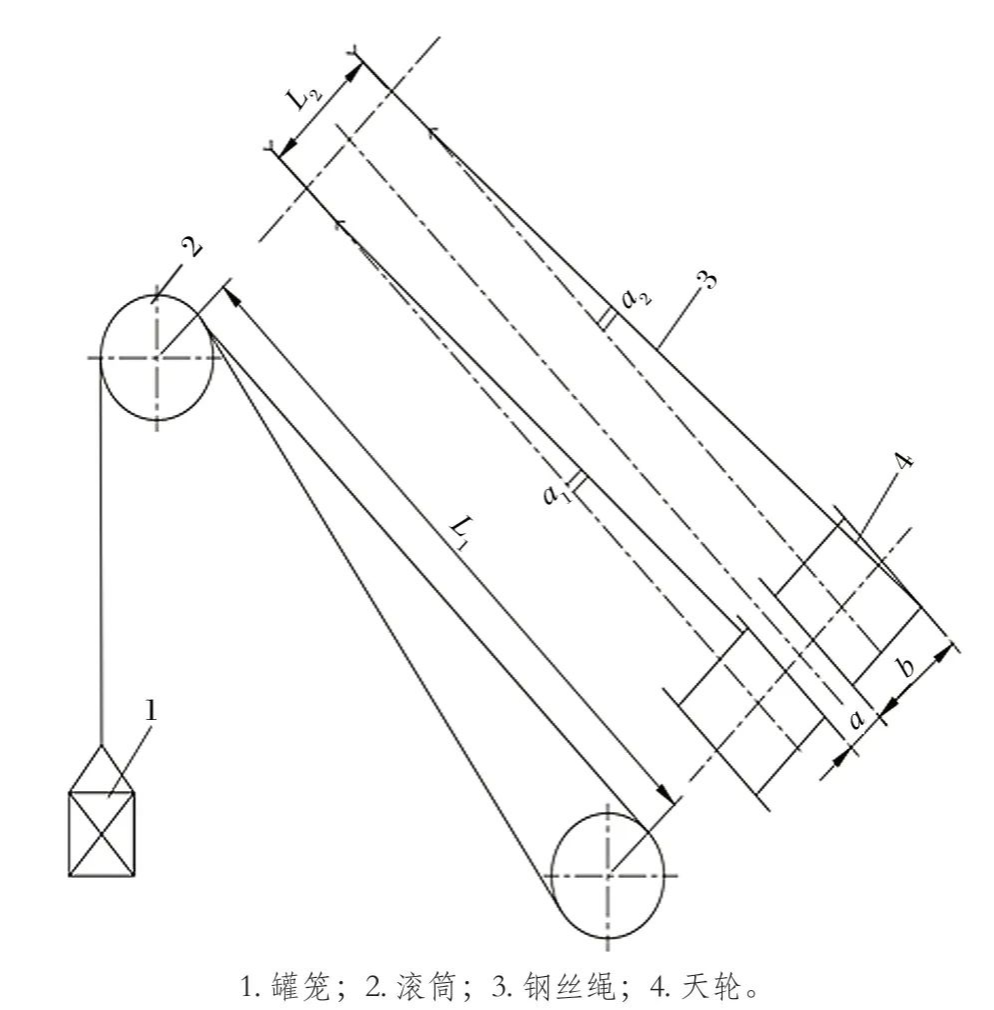 天輪內(nèi)外偏角示意如圖 1 所示,為了確定是否因鋼絲繩內(nèi)外偏角偏大導(dǎo)致的鋼絲繩異常磨損,需要對(duì)提升機(jī)的內(nèi)外偏角進(jìn)行測(cè)量。由圖 1 可知,α1 為天輪鋼絲繩內(nèi)偏角,α2 為天輪鋼絲繩外偏角,當(dāng)鋼絲繩處于左右擋繩板附近時(shí),鋼絲繩與天輪的偏角達(dá)到zui大。
